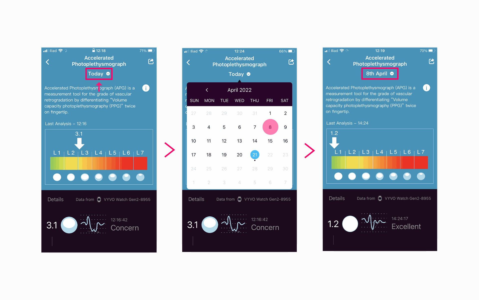 2. On top, under the "Accelerated Plethysmography" title, you will find Today . If you click on it, a calendar will appear, and you can view your health records for a specific day.
