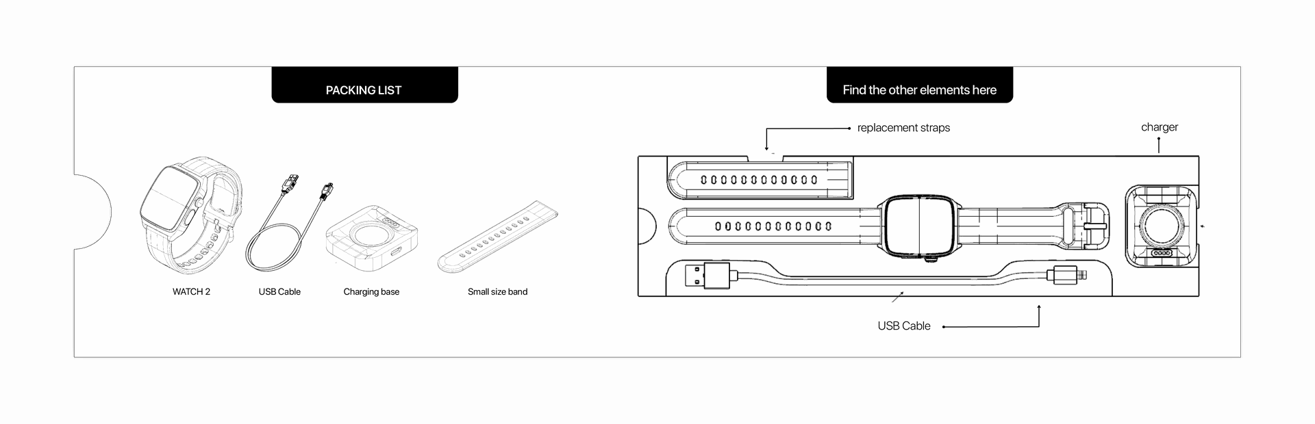 On the back of the same card you will find the device content list and their location. The watch is on top of the foam. Move the foam out of the box to find the replacement strap, the charger and the USB cable in the foam sides.