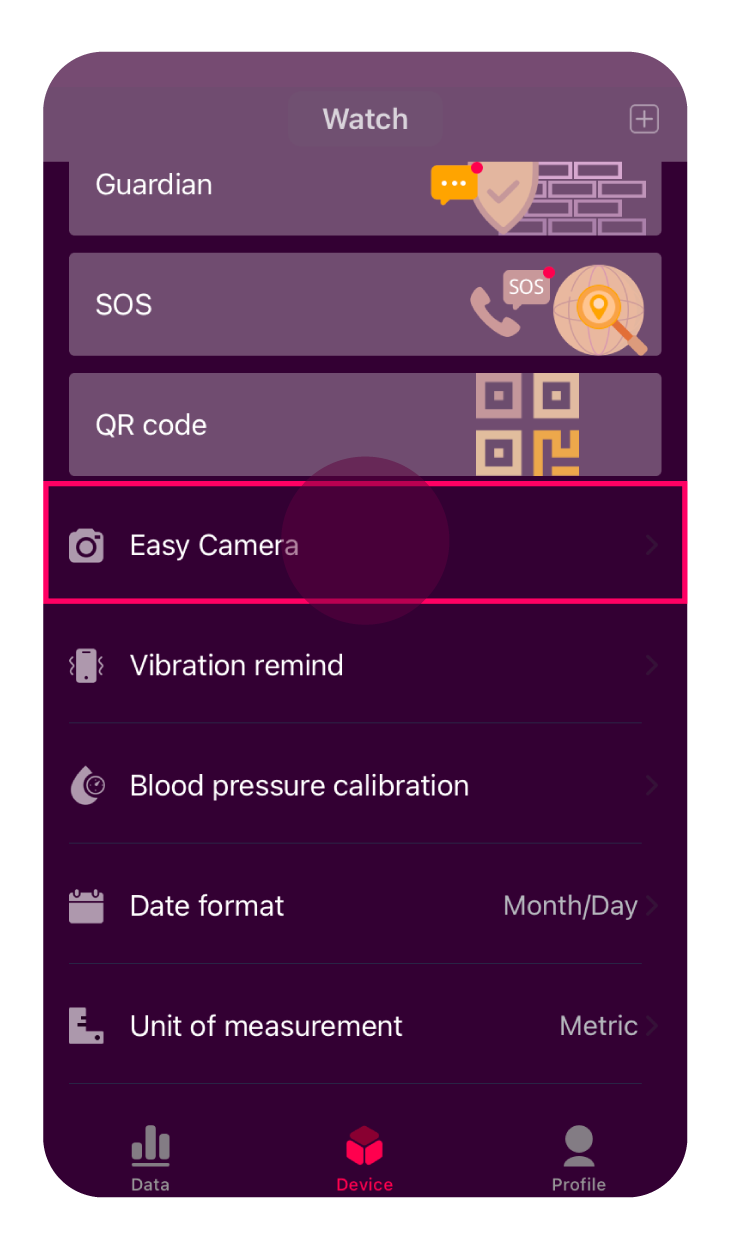 The App allows you to take pictures on your phone using your Device. This can be useful when shooting selfies from a distance, as you can touch the lens icon displayed on the device screen to shoot the picture.