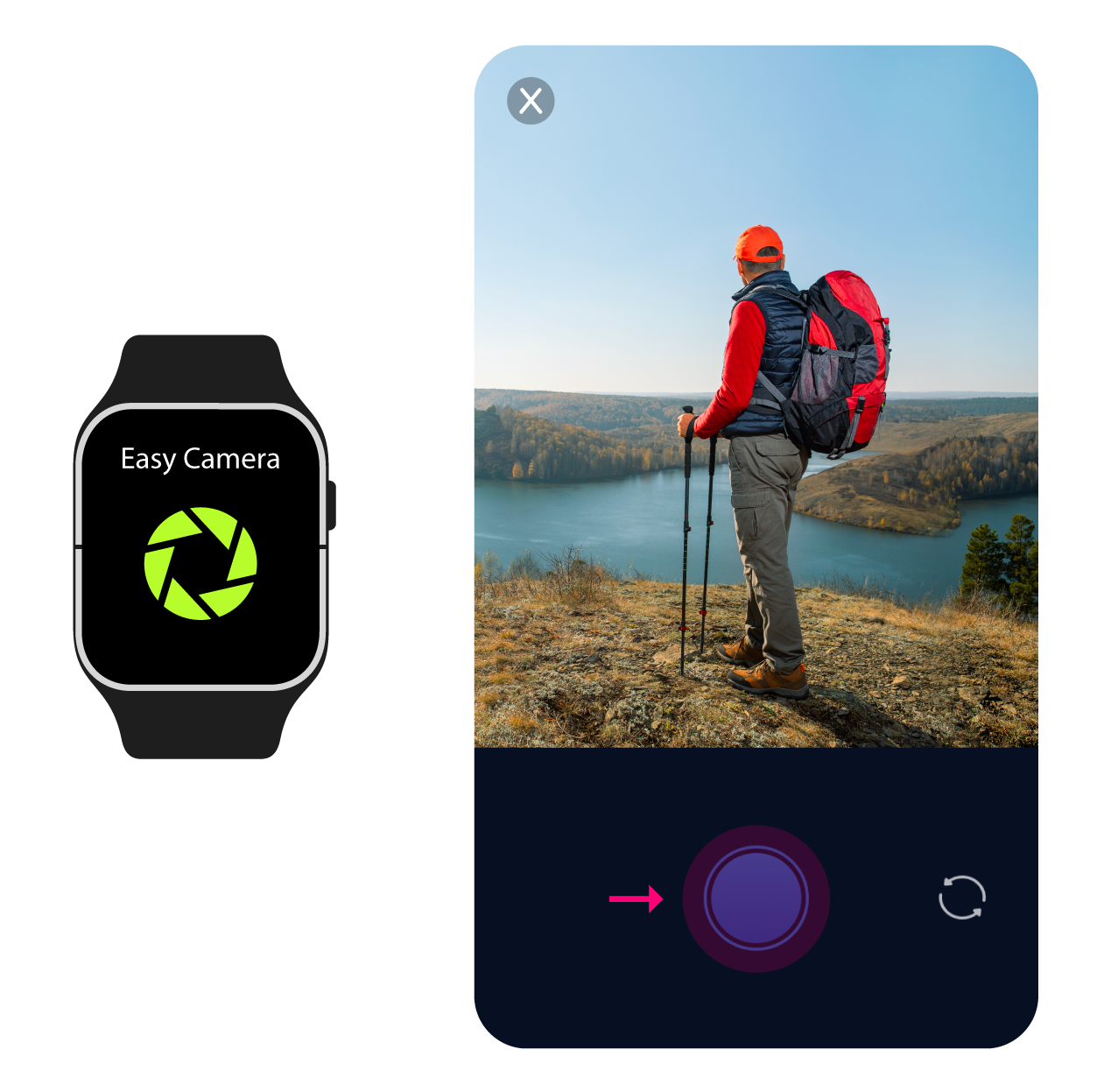 3. Just click on it to activate the camera. On your LifeWatch screen will be displayed a lens icon: touch it to capture the picture. Otherwise, you can just click on the blue button on the phone’s screen just like a regular smartphone camera.
