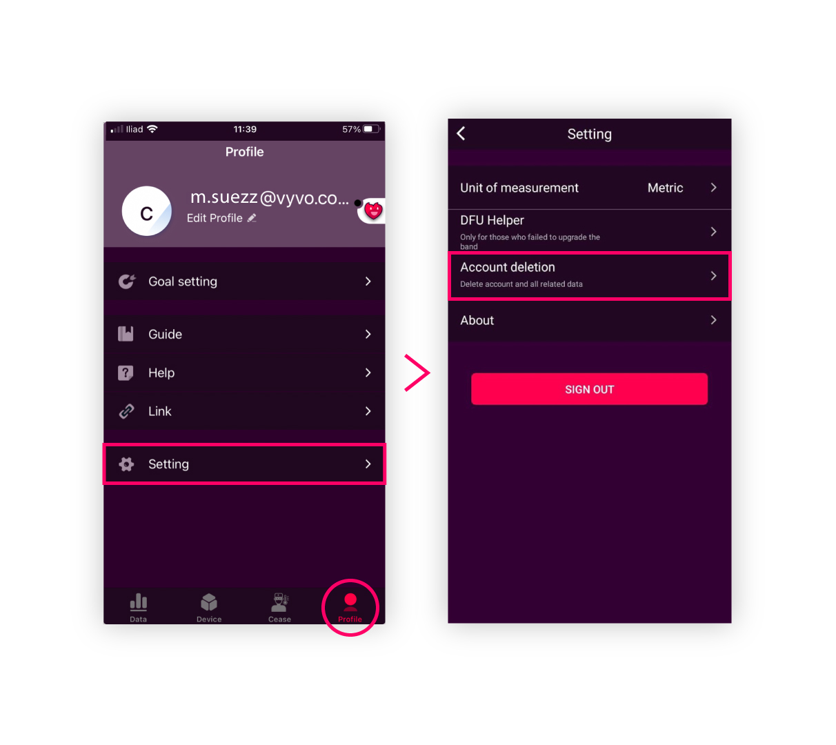 2. Go in the Profile page and click on Setting . Here you will find the “ Account deletion ” option. Click on it.