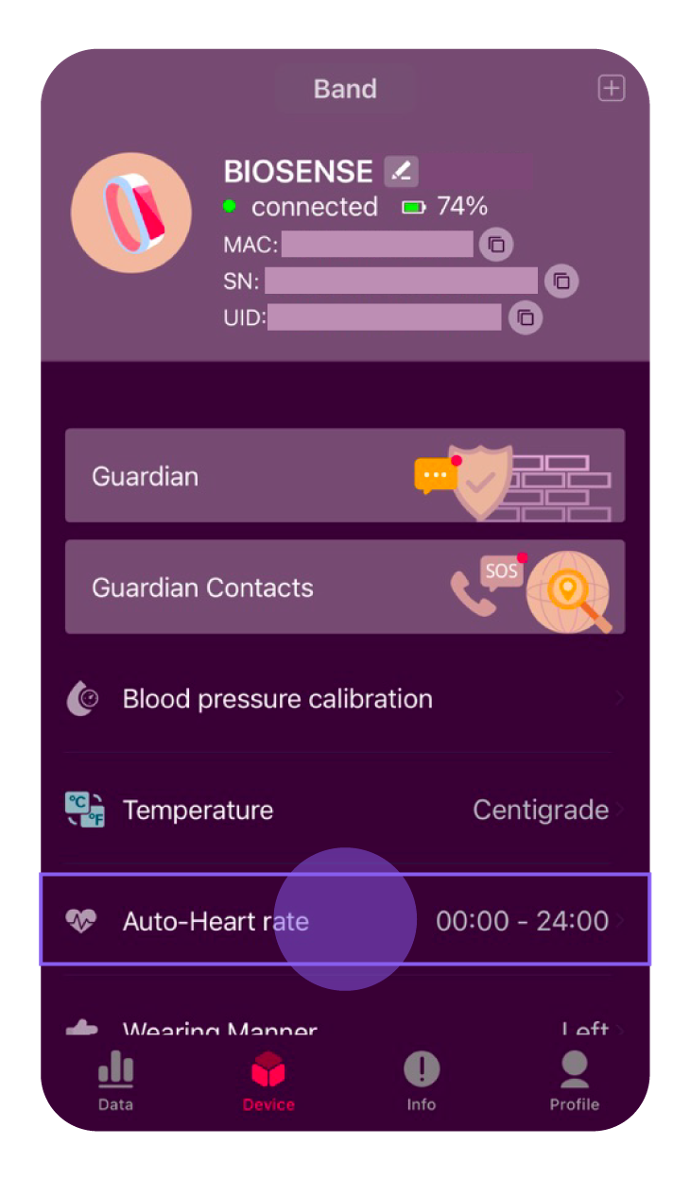 The Auto-Heart rate located on the Device page of the App allows your BioSense to constantly and automatically measure your Heart Rate.
