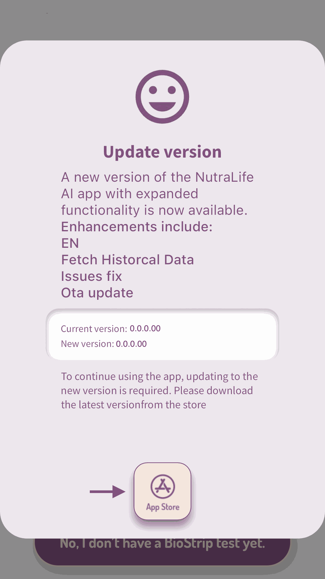 There are two different ways to update the NutraLife AI™ app: OTA (over-the-air) through the App or through the Store.