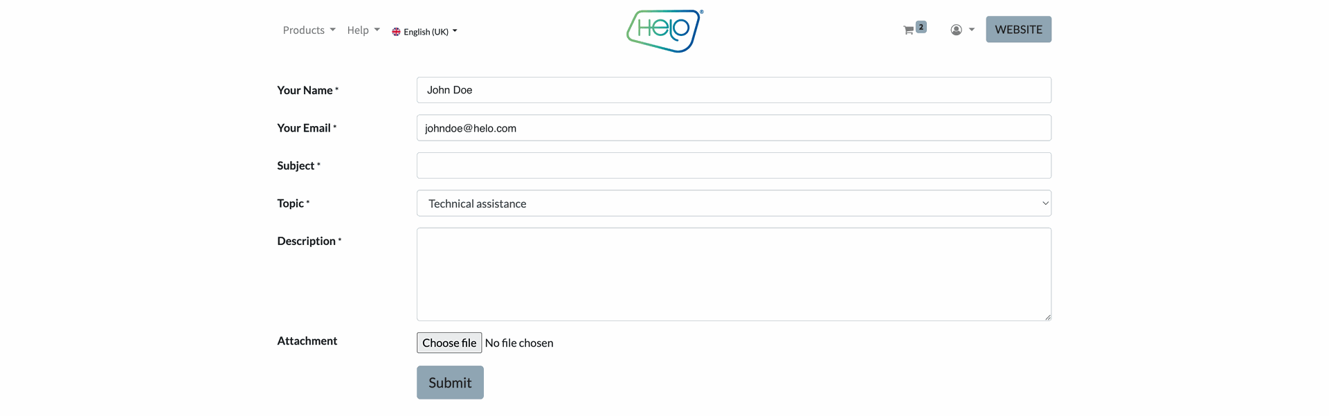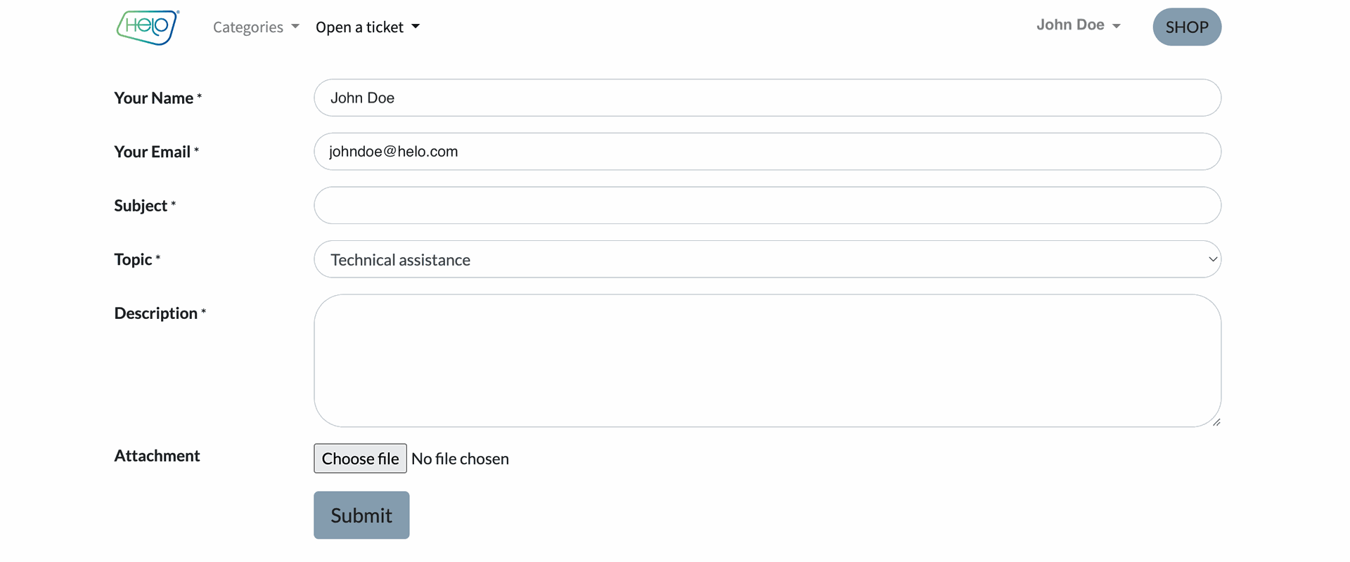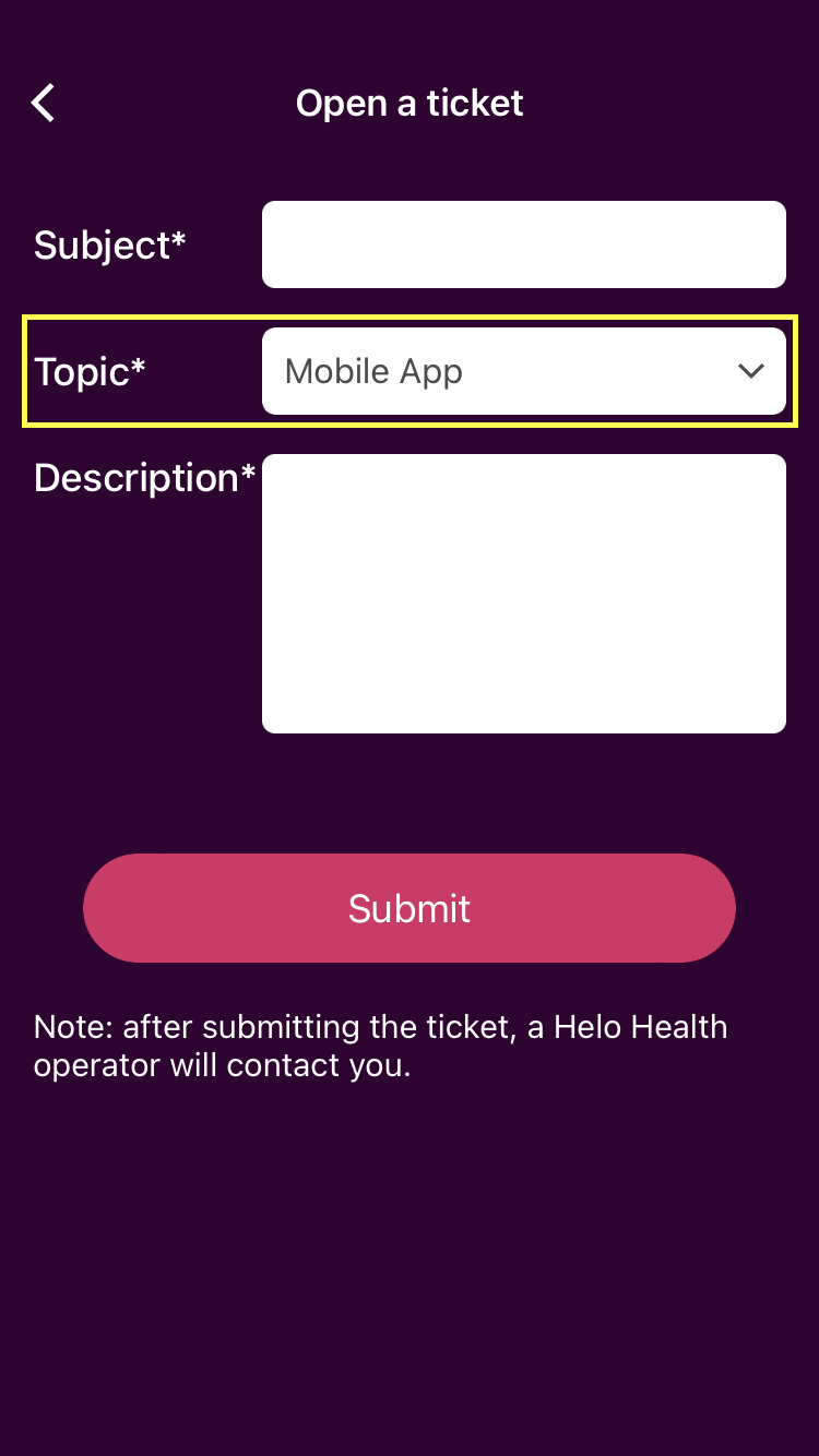 3. Fill in the form with a subject, choose a topic among the ones available, and enter a detailed issue description. Once ready, click “Submit” to send it to our support system. A Helo Health agent will investigate the issue and contact you.